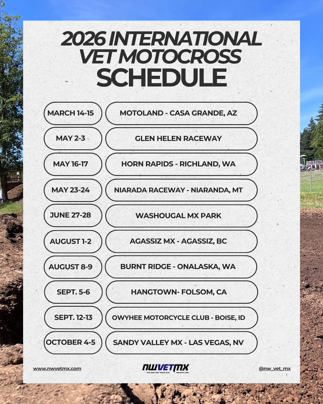Bringing more than 50 years of history forward, the club has been renamed as of the recently renamed Int'l Vet MX Series. Our group of 30+ riders focuses on getting out and enjoying motocross with family and friends. We are also passionate about traveling the Western United States and Canada to Race great tracks.